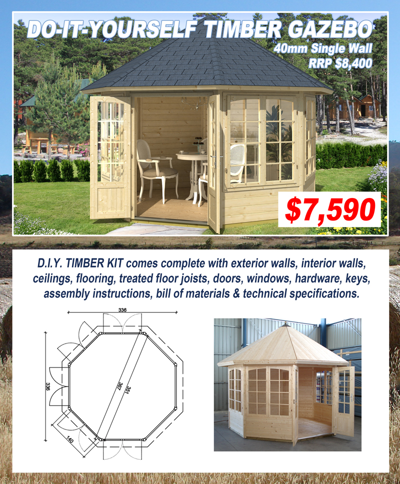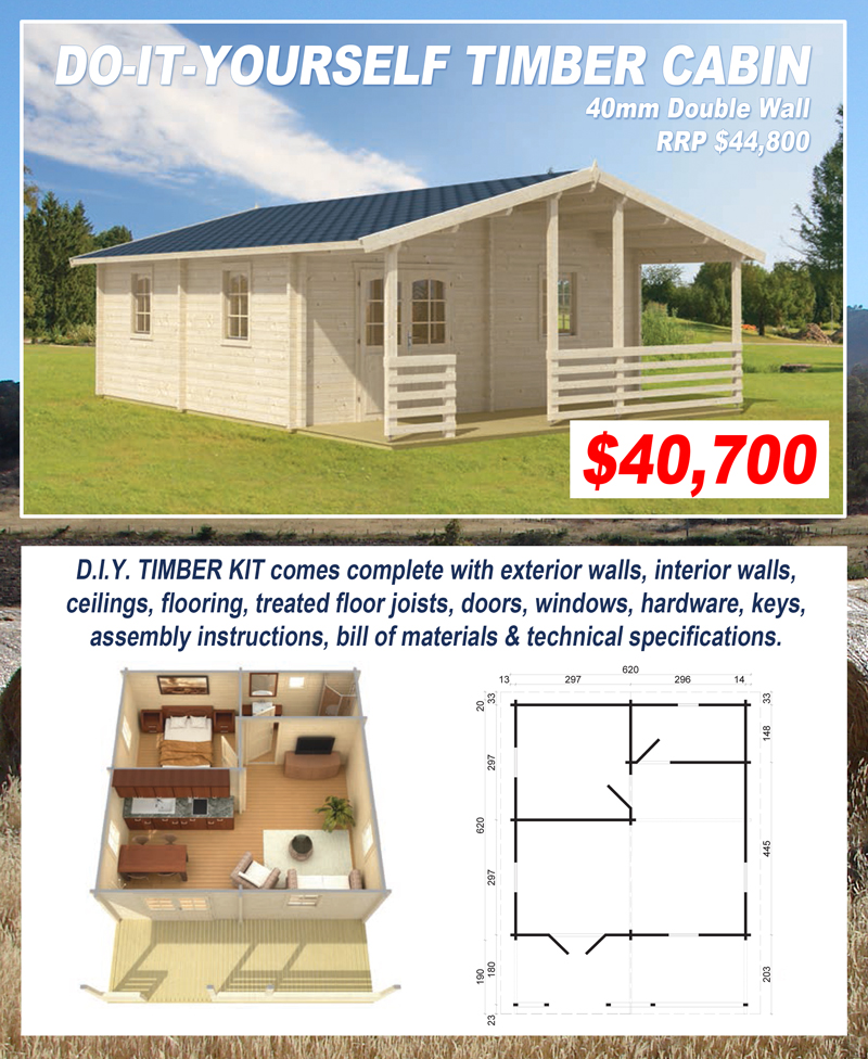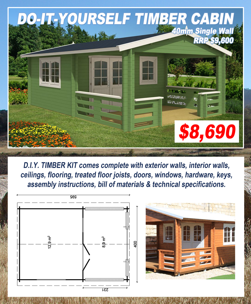 Do-It-Yourself The timber log cabins & structures are stylish, affordable & supplied in easy to assemble do-it-yourself kits making them ideal for the owner builder. All kits come complete with exterior walls, pre-assembled gable ends, interior walls, ceilings, flooring, treated floor joists, doors, windows, hardware, keys & assembly instructions. The buildings are designed & manufactured with a focus on high quality product & simple construction. They slot together easily with interlocking joints & corners ensuring an airtight & weatherproof structure. They are manufactured from kiln dried spruce which is well known for its consistent qualities. The timber is strong, durable, resistant to splitting & considered one of the most stable woods for log construction. The timber is sourced from ecologically managed, sustainable regrowth forests, minimising the damage caused to our environment. The log cabins & structures are an environmentally friendly & energy efficient solution providing a pre-sanded smooth interior & exterior finish. Once assembled, the buildings are ready for the timber finish & roofing of your choice. IN STOCK NOW The DIY timber kits we currently have in stock can also be viewed on our Gumtree page. |